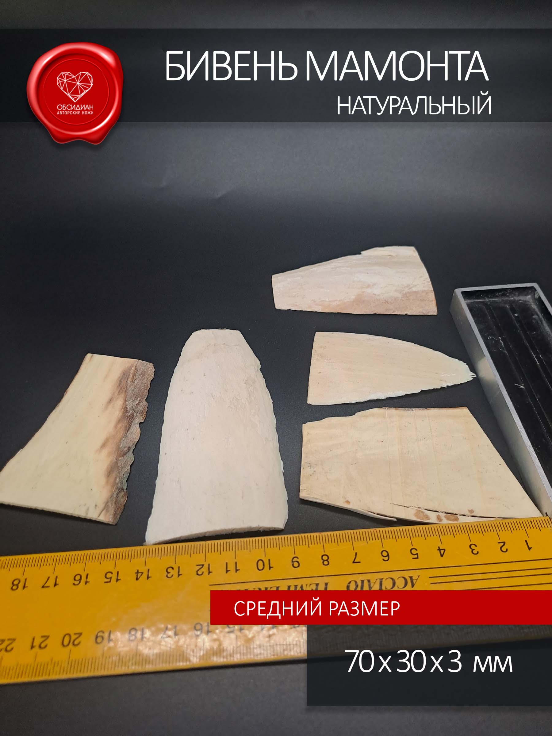 Редкий природный материал возрастом более 15000 лет. Натуральный бивень мамонта кремово-белого оттенка, нарезанный тонкими пластинами, подходит для создания аксессуаров.
