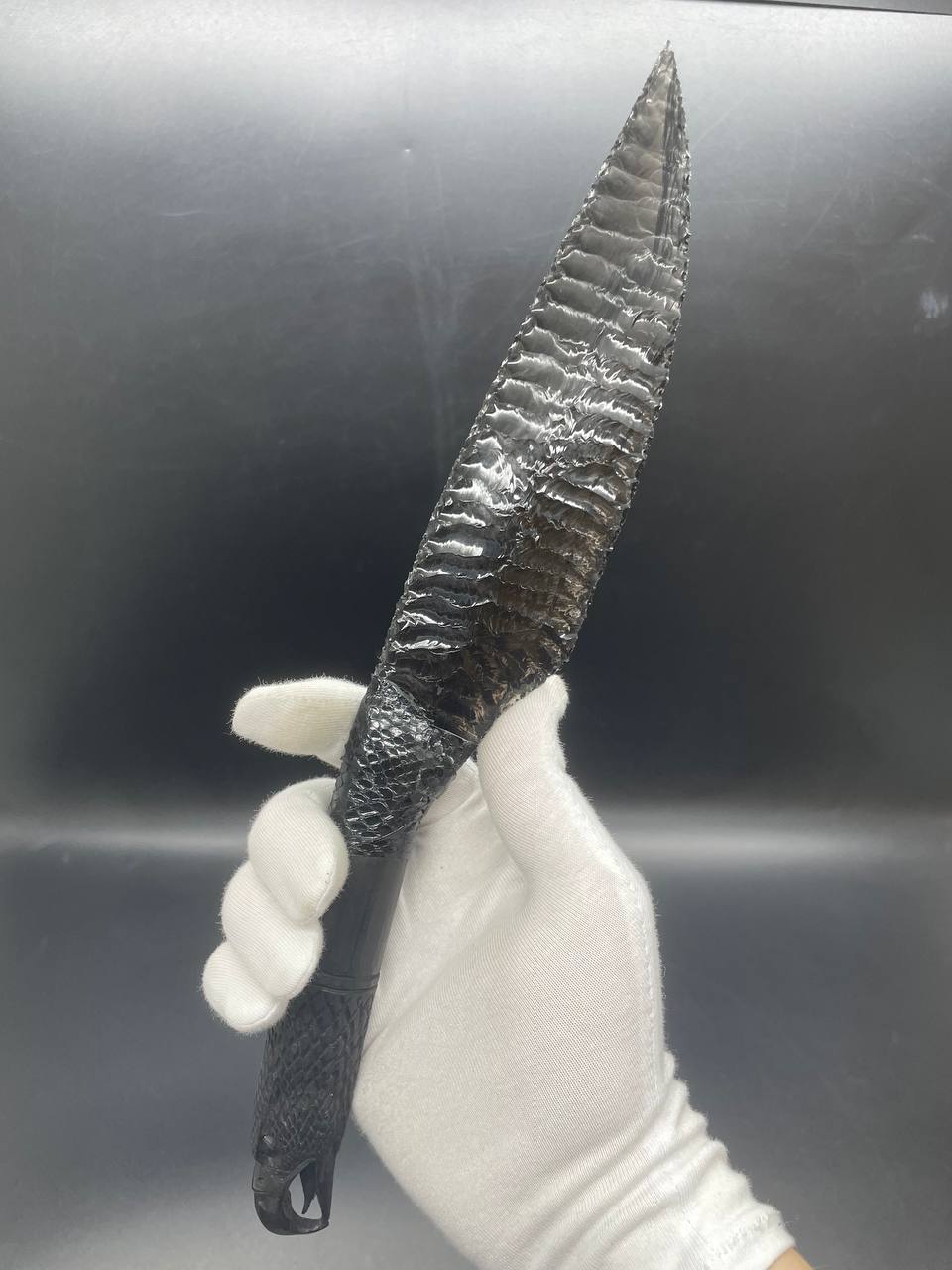 Каждое лезвие — результат точной ювелирной работы. Обработка обсидиана осуществляется вручную методом скалывания, что позволяет добиться острых краёв и придать изделию аутентичный облик древнего артефакта.