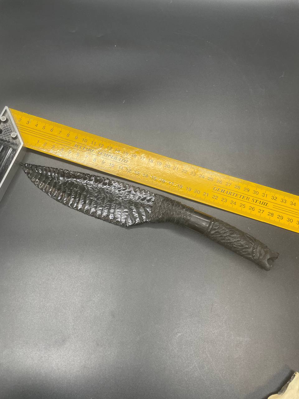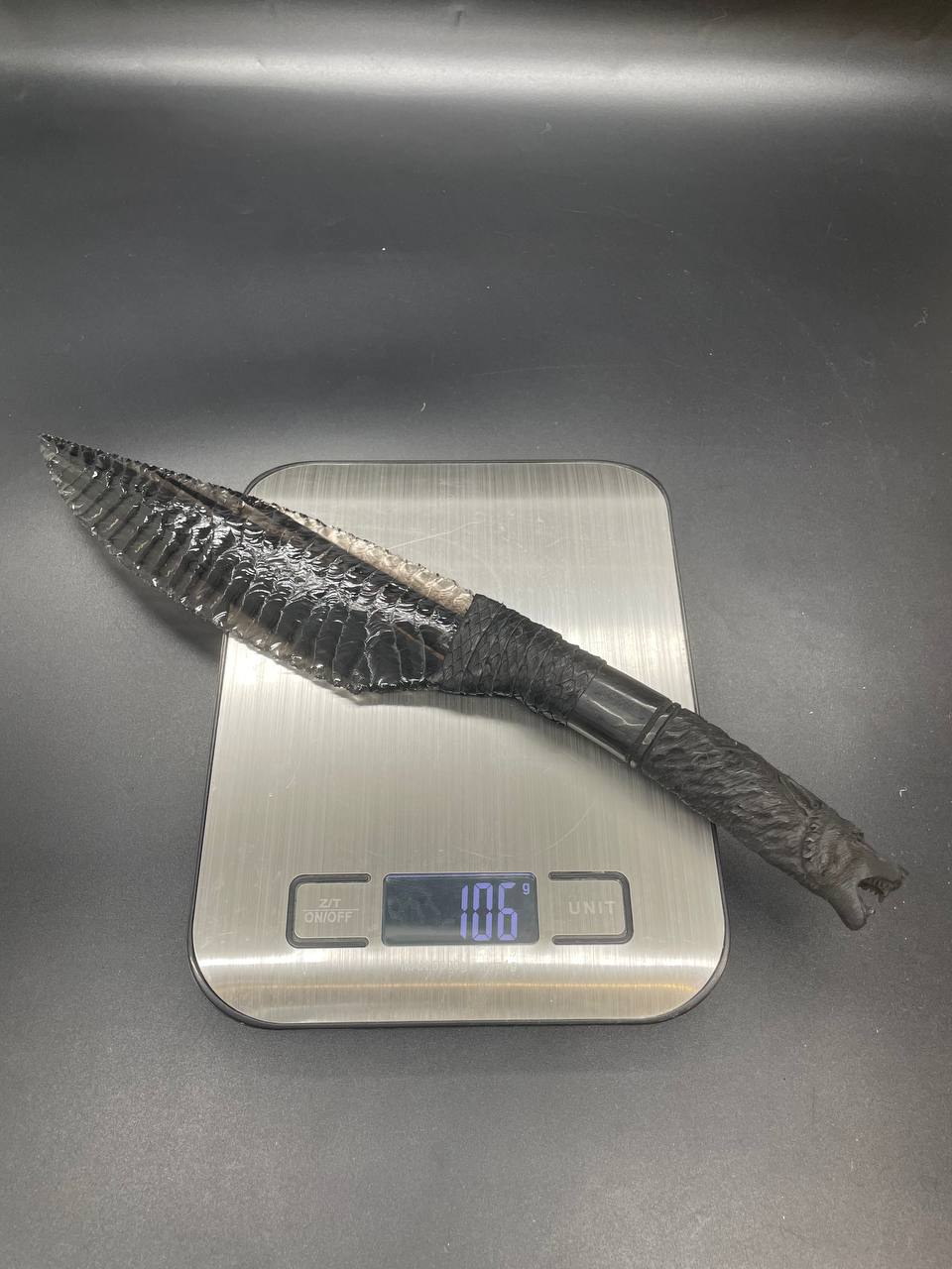 Клинок изготовлен из натурального обсидиана, вулканического стекла, которое издавна использовалось для создания ритуальных и охотничьих предметов. Обсидиан добывается на склонах горы Арагац в Армении — одном из немногих мест на планете, где можно найти этот редкий камень в высоком качестве.