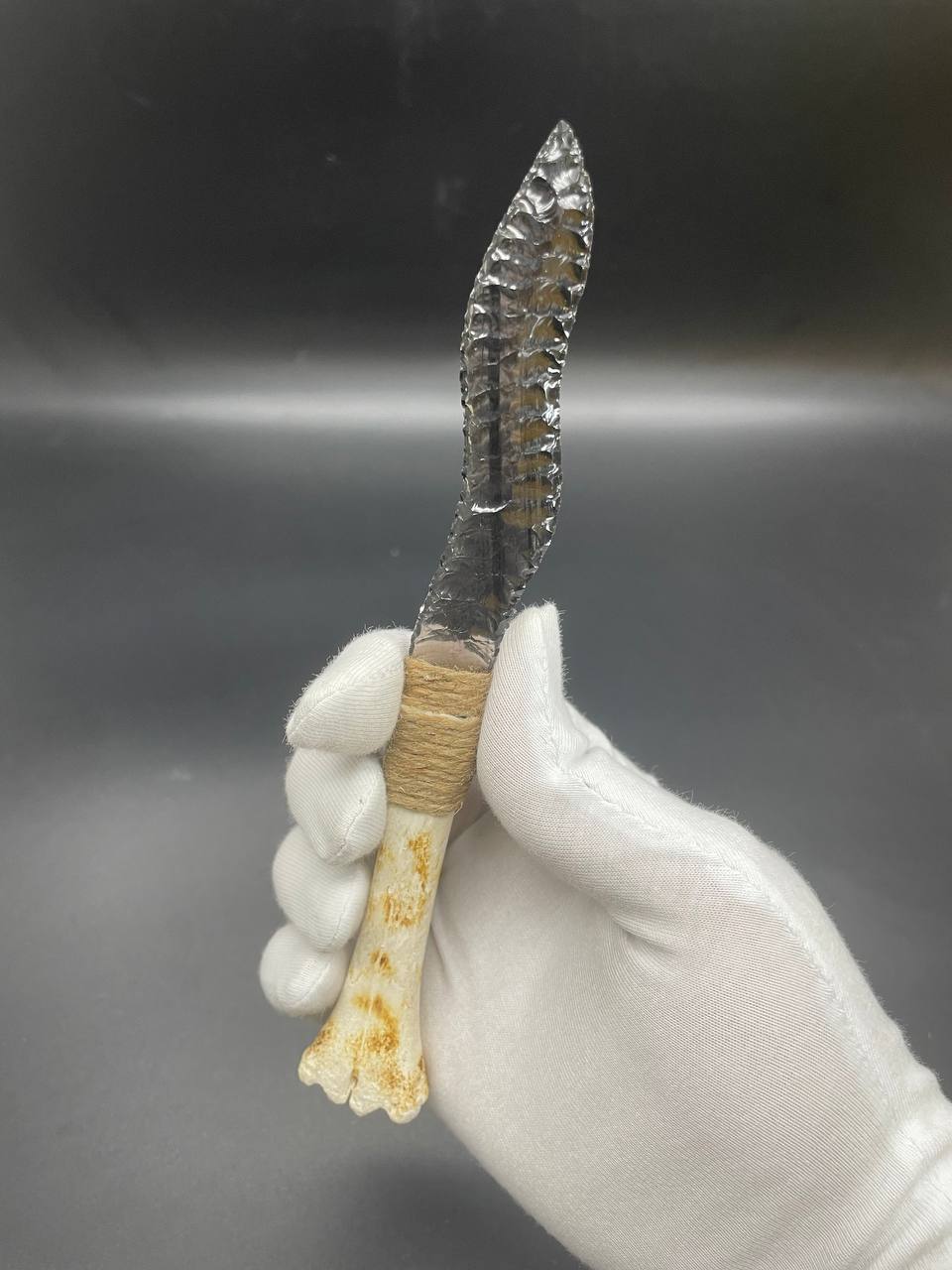 Каждое лезвие — результат точной ювелирной работы. Обработка обсидиана осуществляется вручную методом скалывания, что позволяет добиться острых краёв и придать изделию аутентичный облик древнего артефакта.