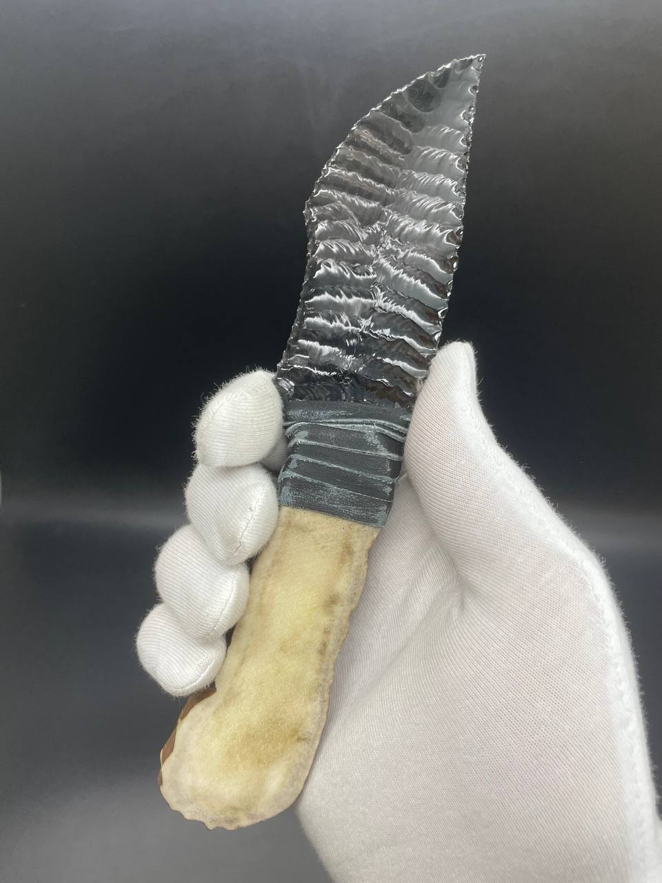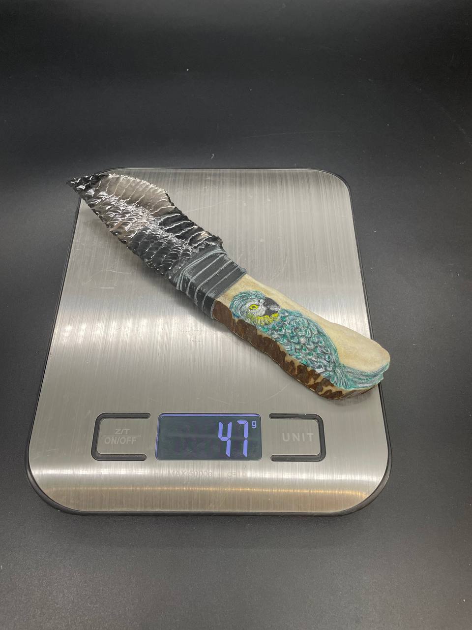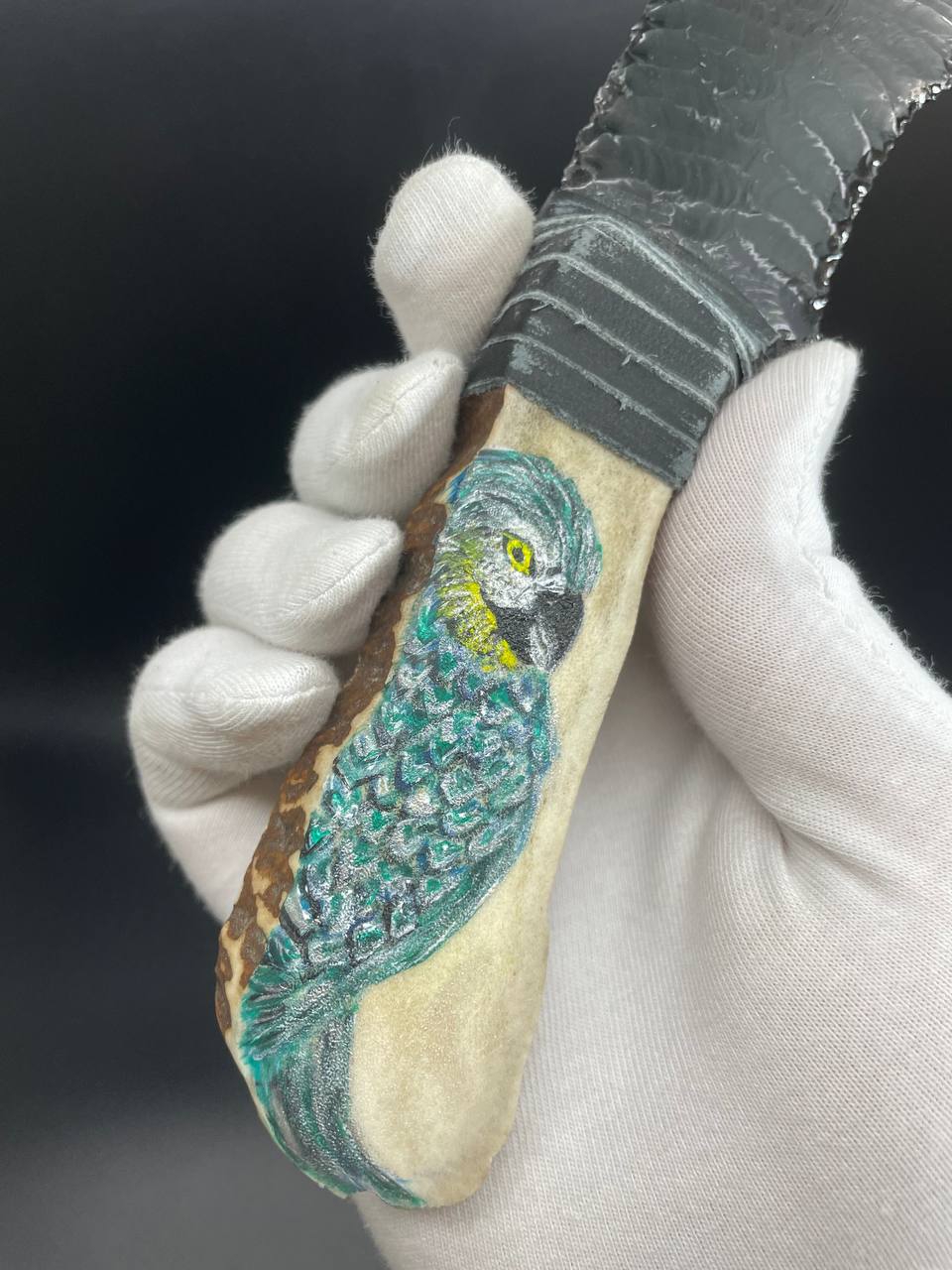 Обсидиановый нож с рукояткой из рога оленя с рисунком попугая 17 см