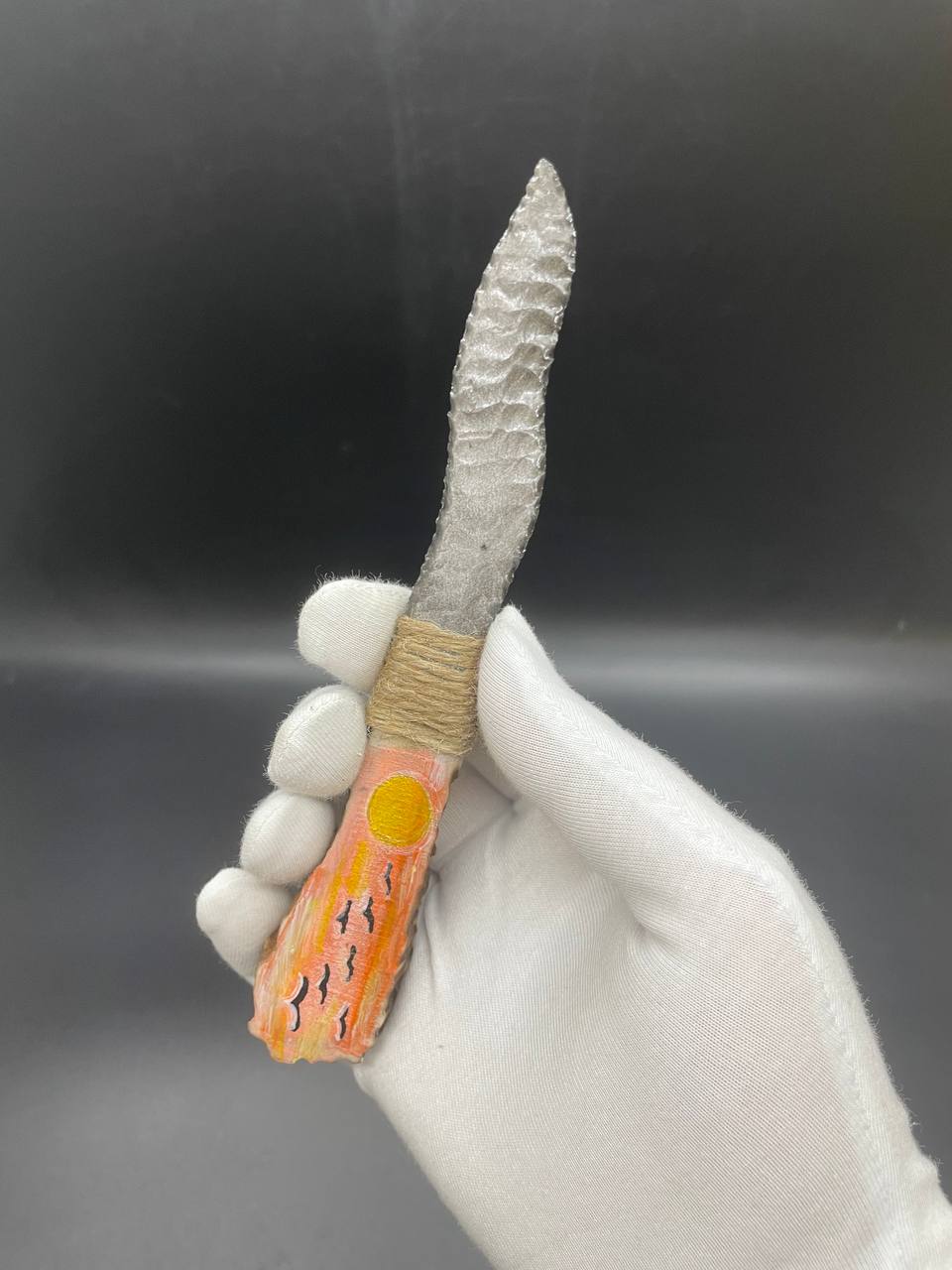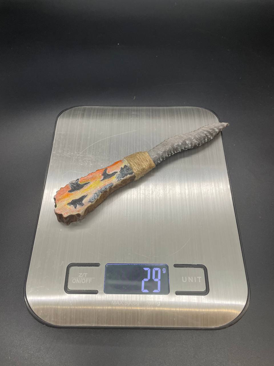 Обсидиановый нож зигзаг с рукояткой из рога оленя с рисунком "Закат и птицы" 15 см
