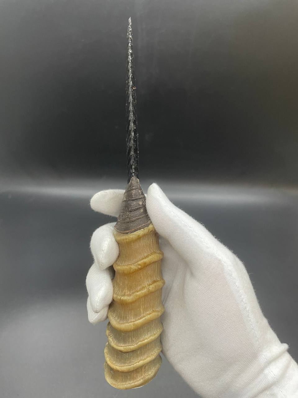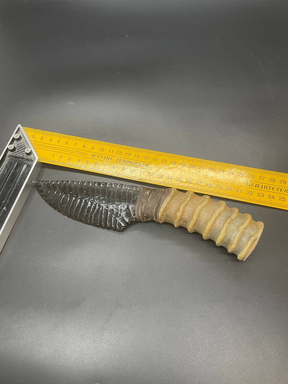 Клинок изготовлен из натурального обсидиана, вулканического стекла, которое издавна использовалось для создания ритуальных и охотничьих предметов. Обсидиан добывается на склонах горы Арагац в Армении — одном из немногих мест на планете, где можно найти этот редкий камень в высоком качестве.